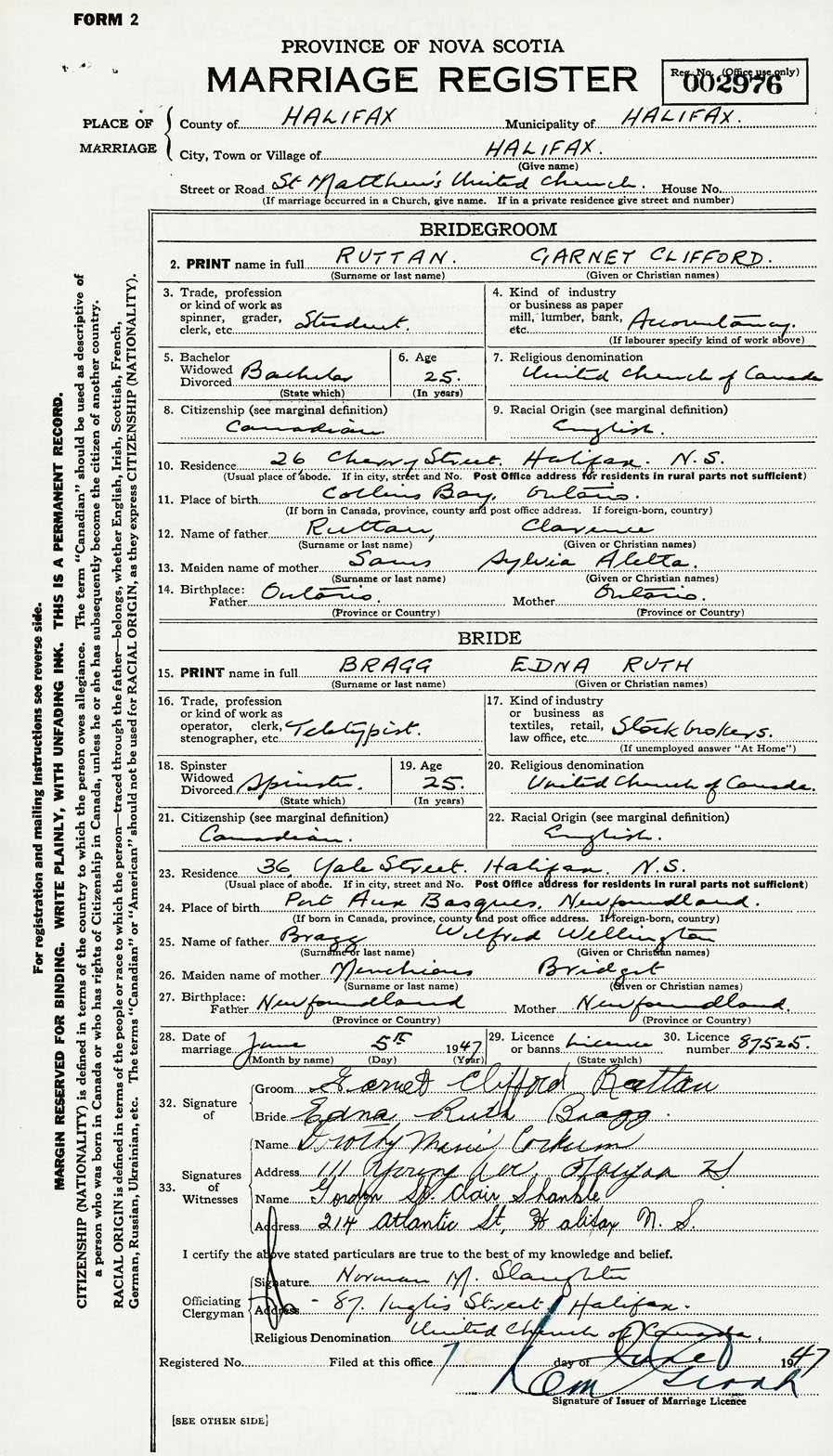 28. Date of marriage June 5 1947 29. By license or banns License 30. License number 87525