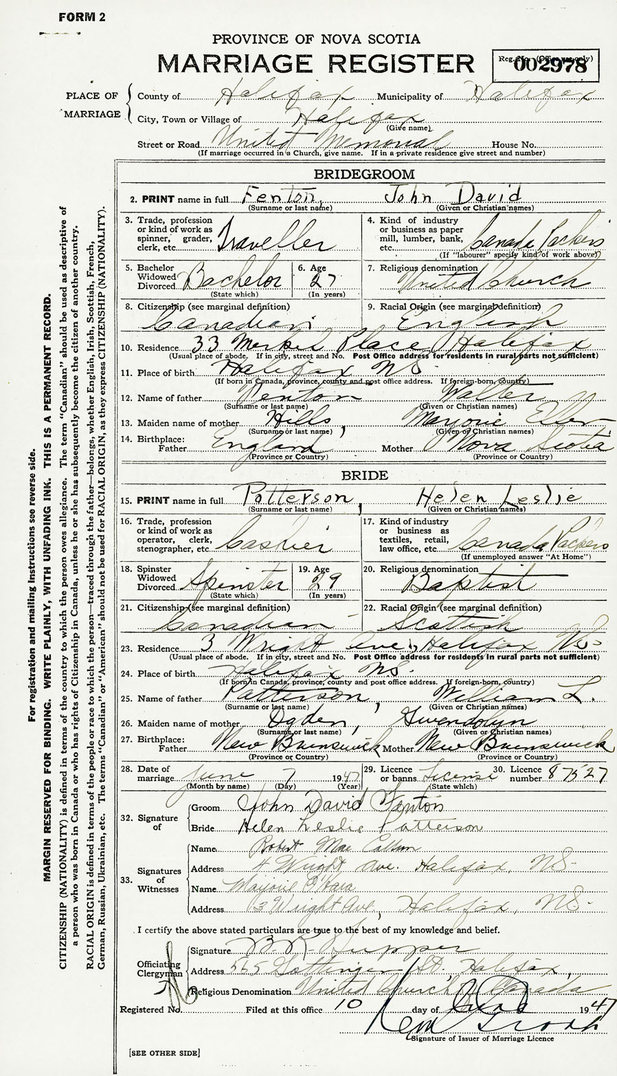 28. Date of marriage June 7 1947 29. By license or banns License 30. License number 87527