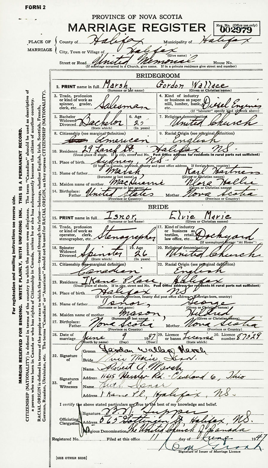 28. Date of marriage June 9 1947 29. By license or banns License 30. License number 87529