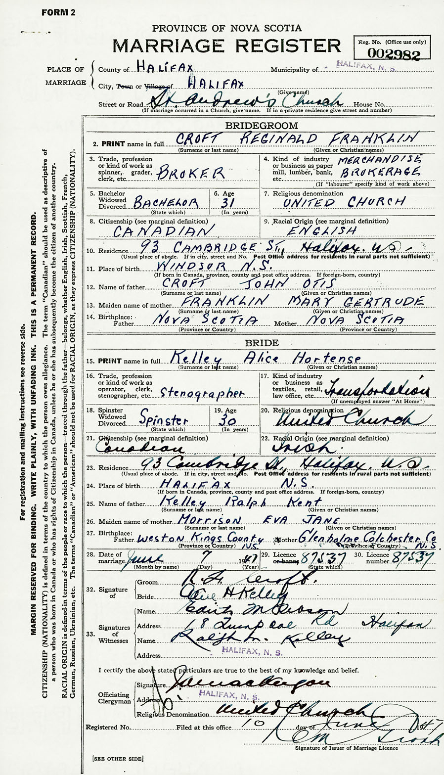 28. Date of marriage June 7 1947 29. By license or banns License 30. License number 87537