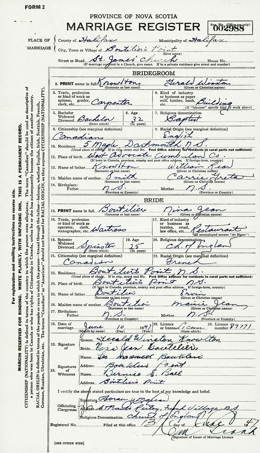 28. Date of marriage June 10 1947 29. By license or banns License 30. License number 87771