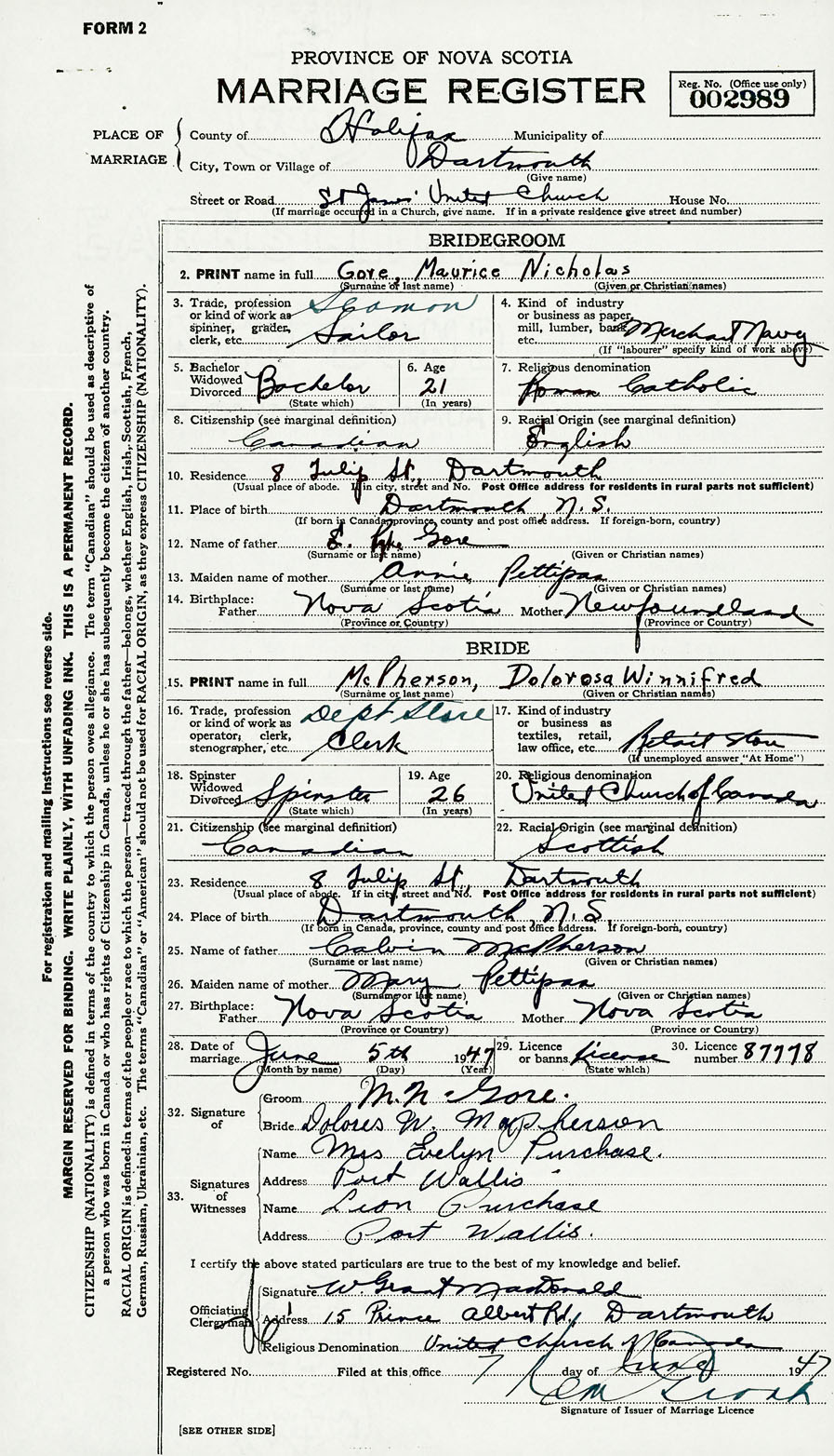 28. Date of marriage June 5 1947 29. By license or banns License 30. License number 87778