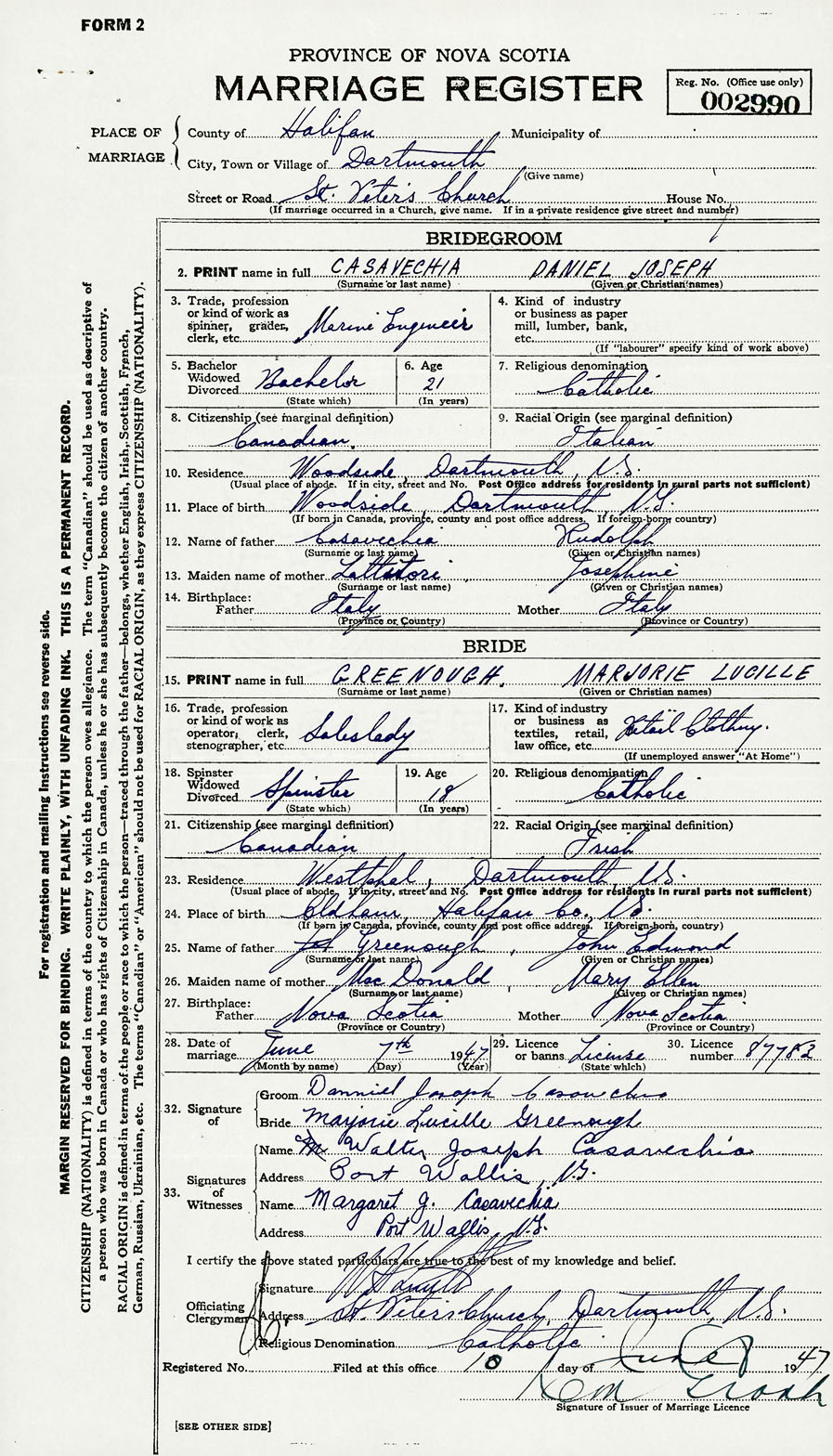 28. Date of marriage June 7 1947 29. By license or banns License 30. License number 87783