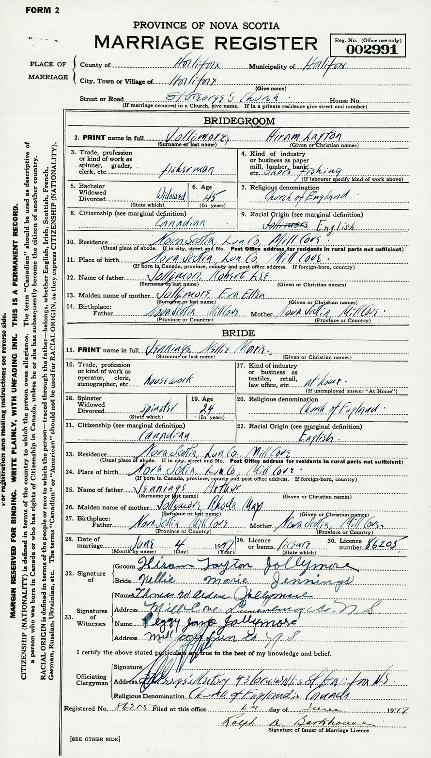 28. Date of marriage June 4 1947 29. By license or banns License 30. License number 86205