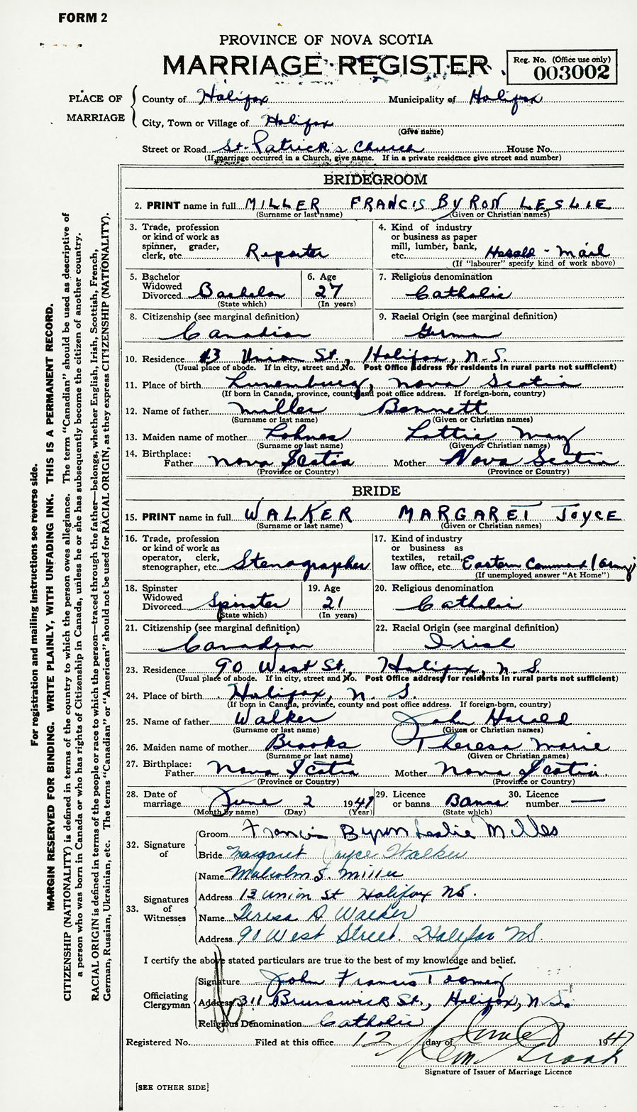 28. Date of marriage June 2 1947 29. By license or banns License 30. License number