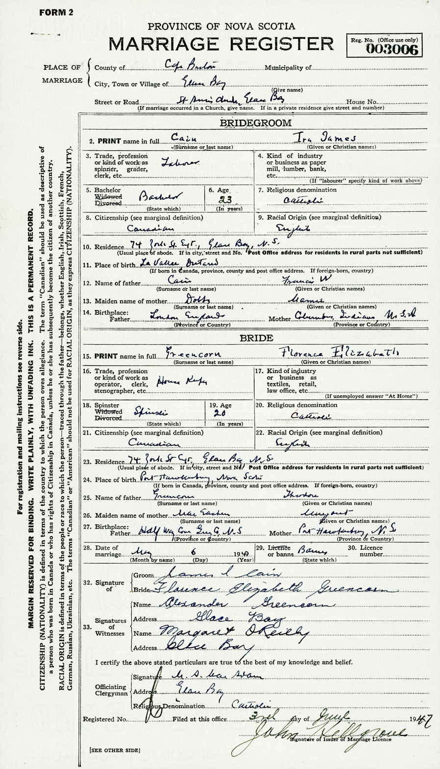 PLACE OF MARRIAGE County of Cape Breton