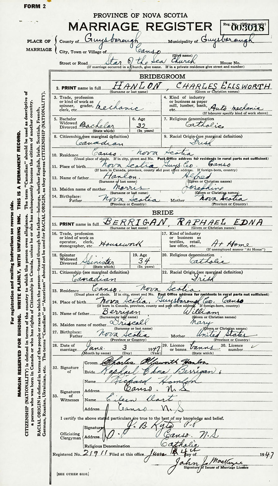 28. Date of marriage June 3 1947 29. By license or banns License 30. License number