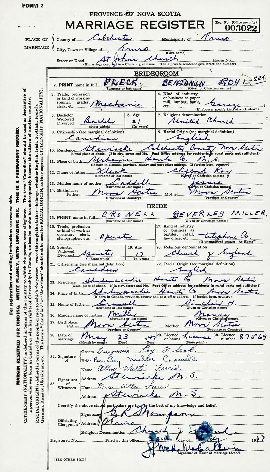 28. Date of marriage May 23 1947 29. By license or banns License 30. License number 87569