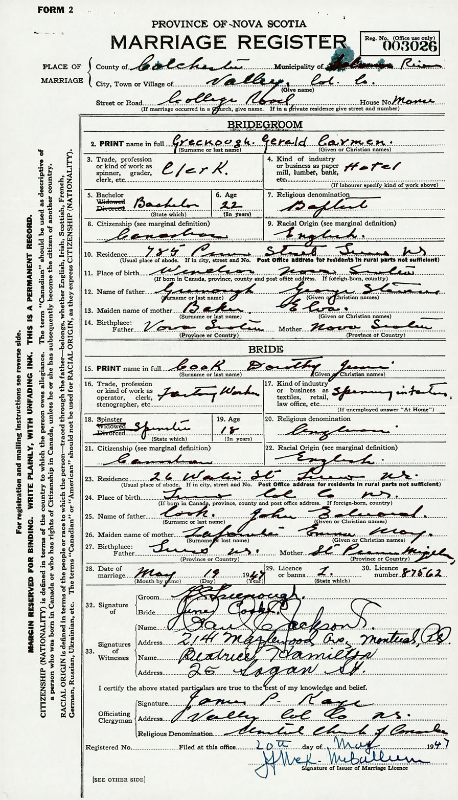 28. Date of marriage May 19 1947 29. By license or banns License 30. License number 87562
