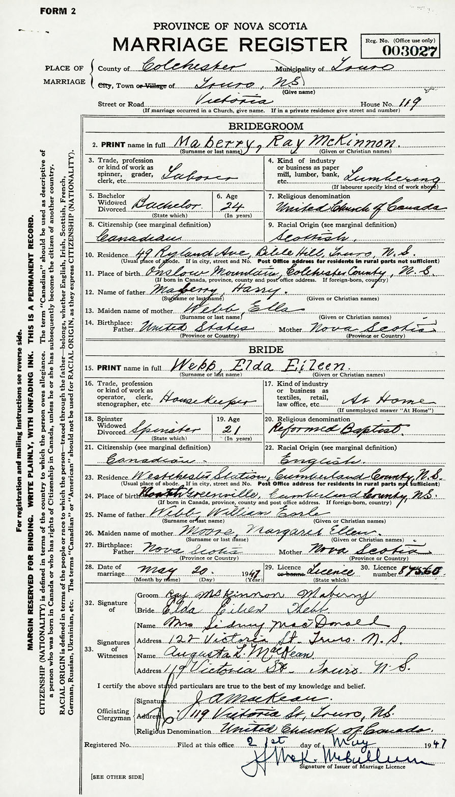 28. Date of marriage May 20 1947 29. By license or banns License 30. License number 87560