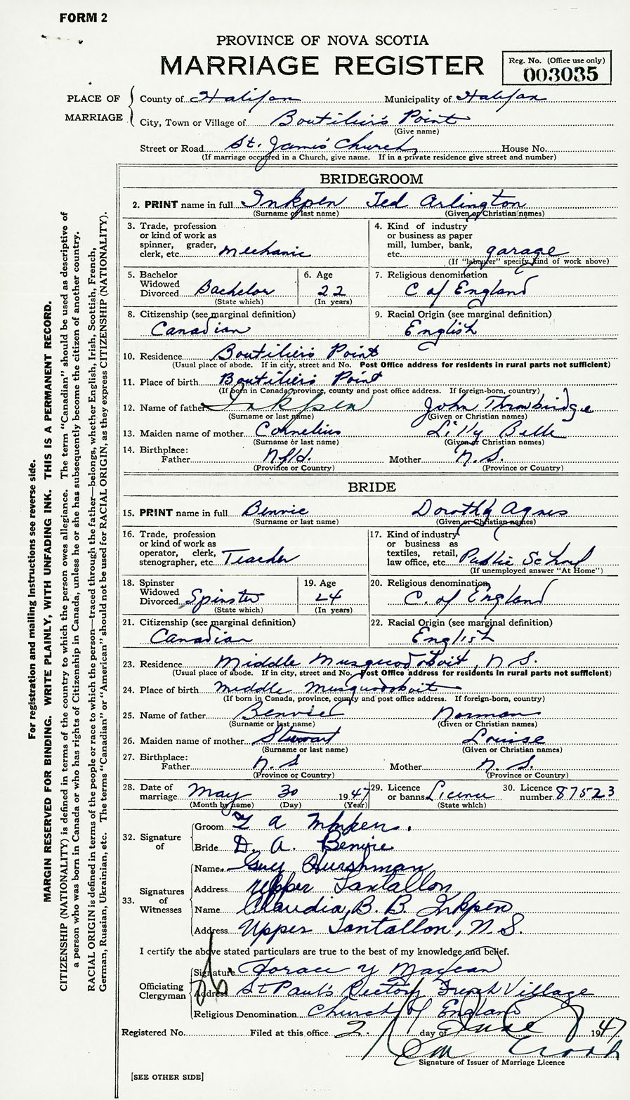 28. Date of marriage May 30 1947 29. By license or banns License 30. License number 87523