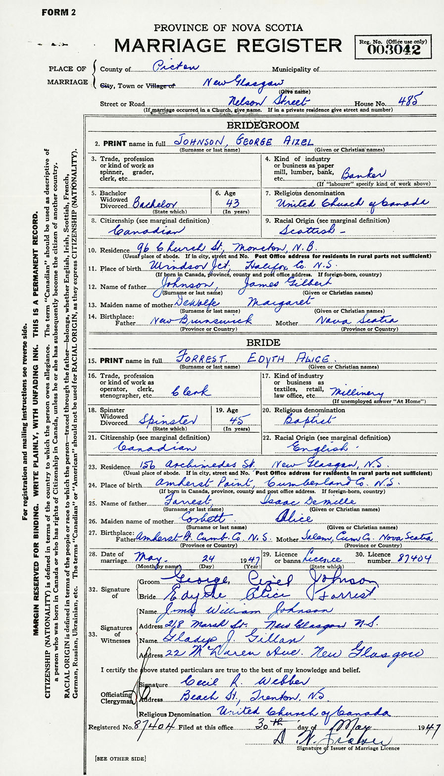 28. Date of marriage May 24 1947 29. By license or banns License 30. License number 87404