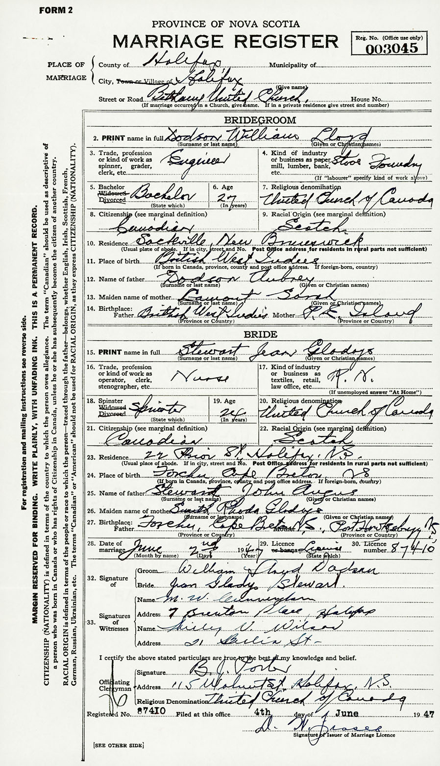 28. Date of marriage June 2 1947 29. By license or banns License 30. License number 87410