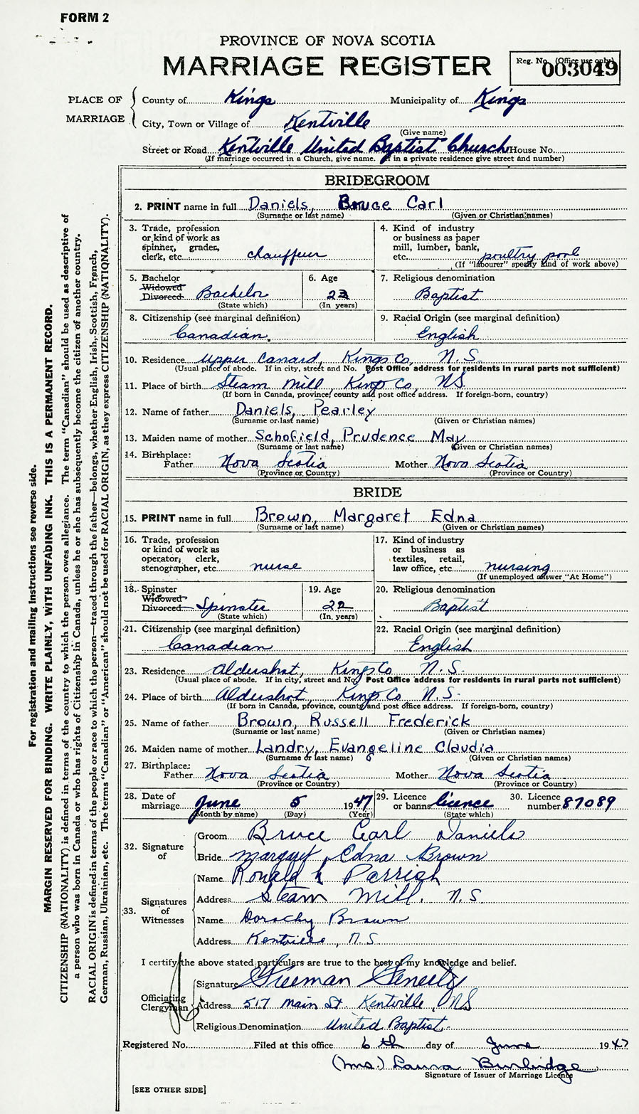 28. Date of marriage June 5 1947 29. By license or banns License 30. License number 87089