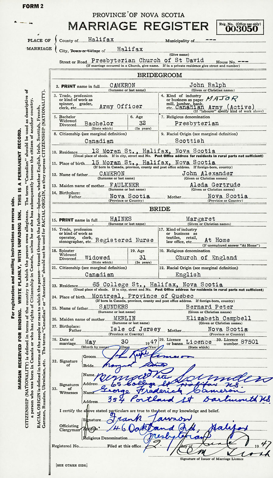 28. Date of marriage May 30 1947 29. By license or banns License 30. License number 87501