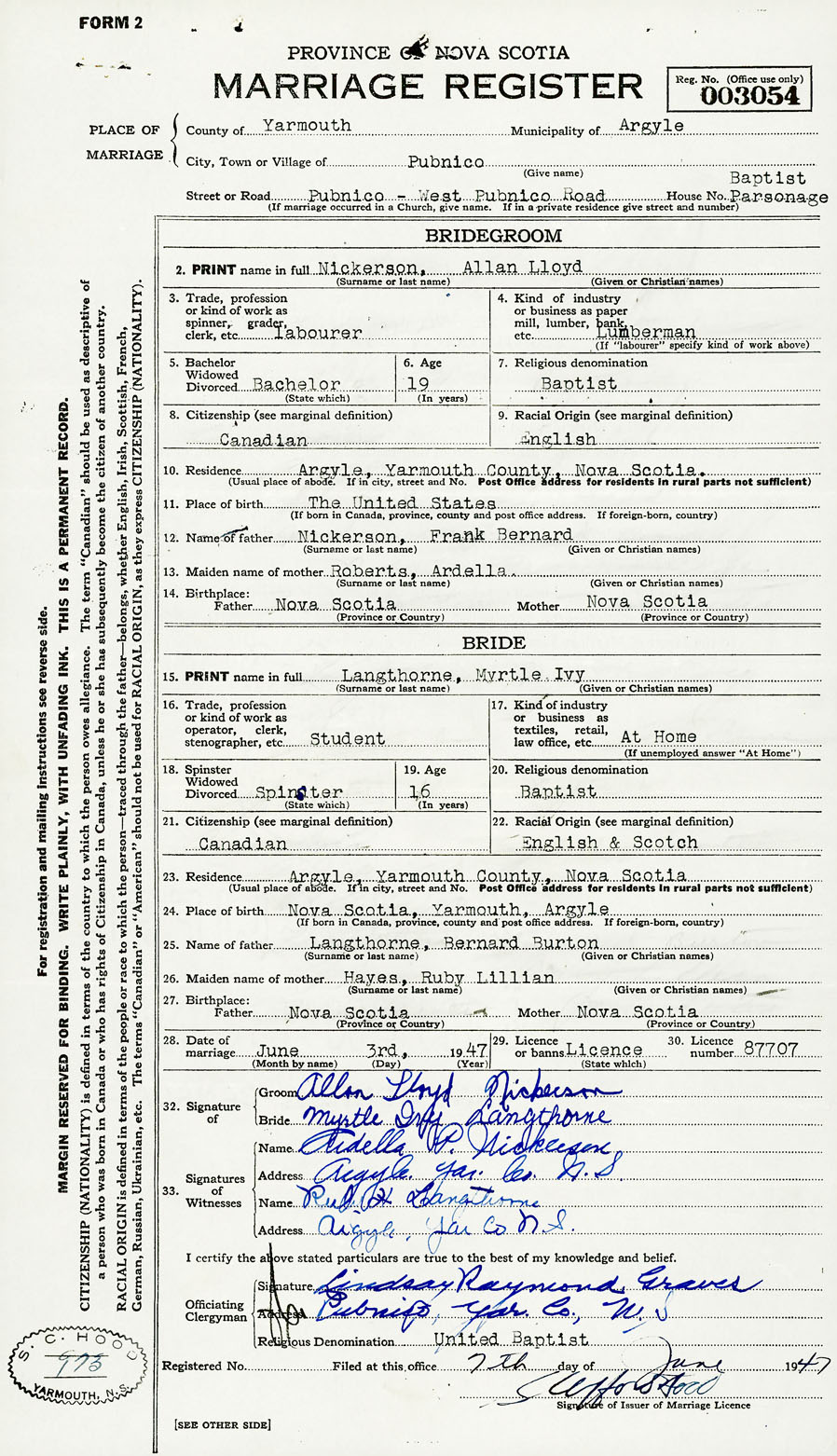 28. Date of marriage June 3 1947 29. By license or banns License 30. License number 87707
