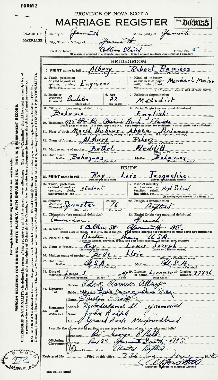 28. Date of marriage June 3 1947 29. By license or banns License 30. License number 87836