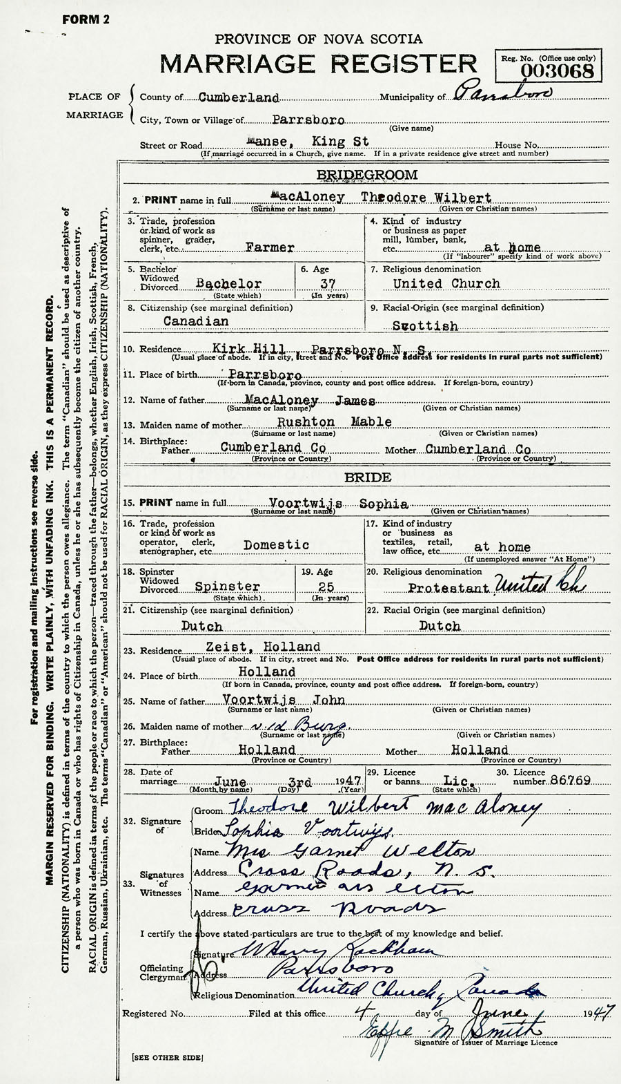 28. Date of marriage June 3 1947 29. By license or banns License 30. License number 86769