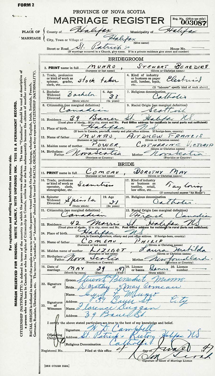 28. Date of marriage May 29 1947 29. By license or banns License 30. License number