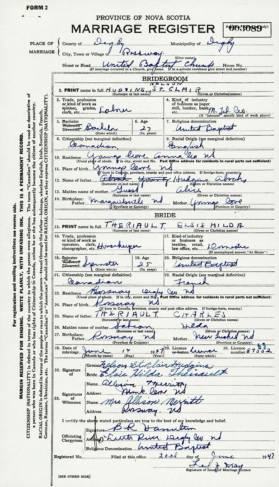Registration: Year: 1947 number: 003089