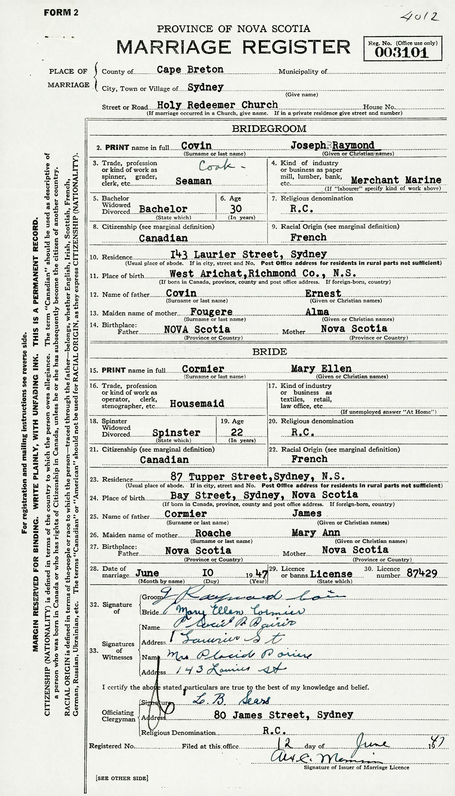 28. Date of marriage June 10 1947 29. By license or banns License 30. License number 87429