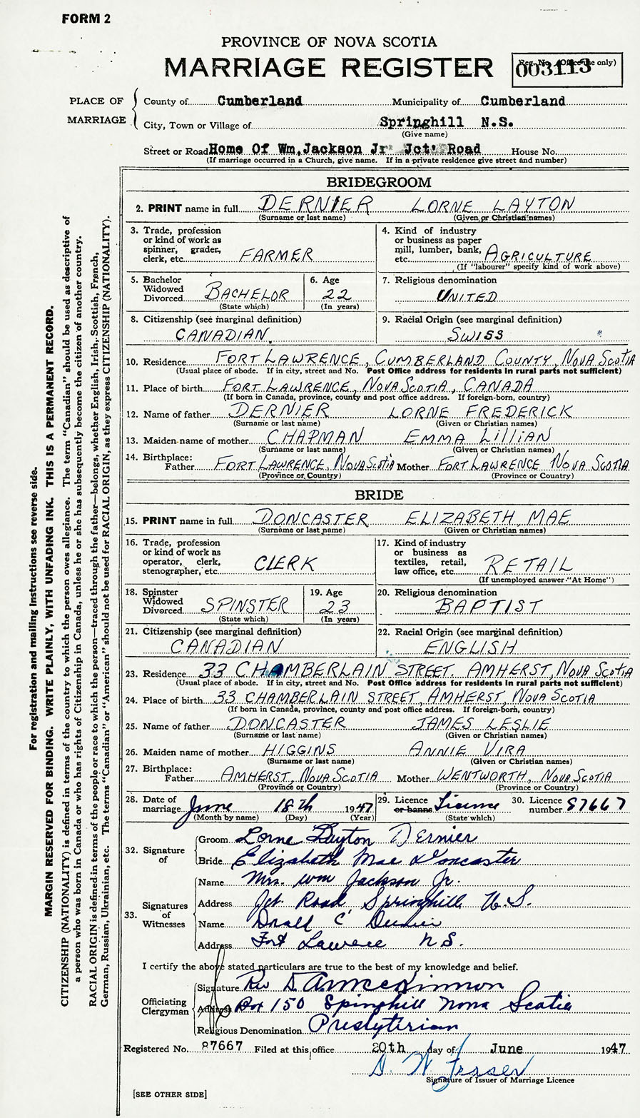 28. Date of marriage June 18 1947 29. By license or banns License 30. License number 87667