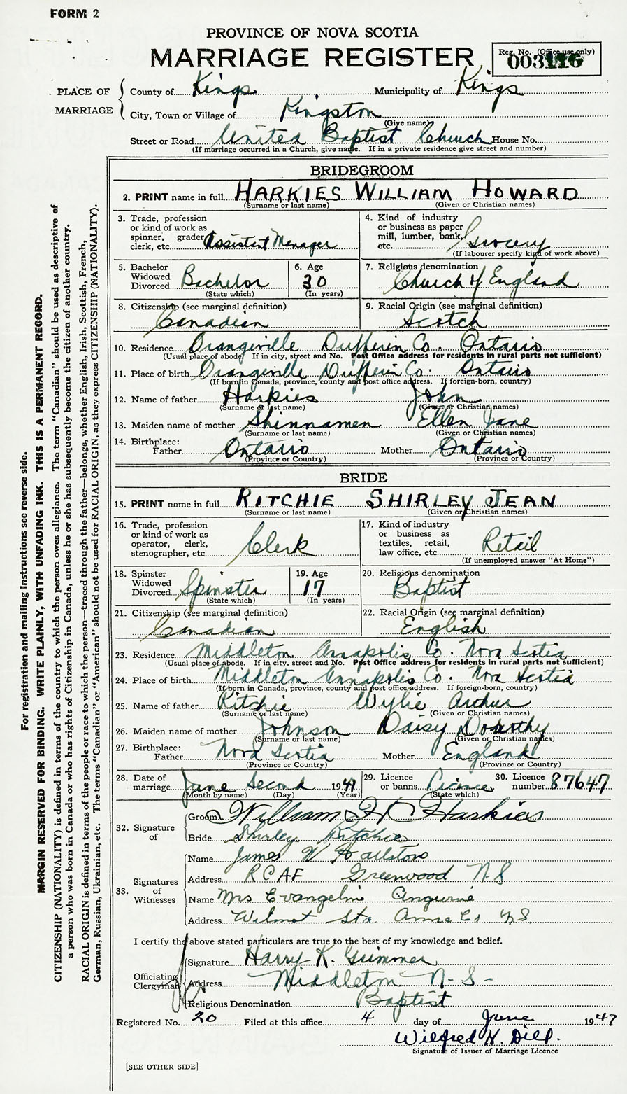 28. Date of marriage June 2 1947 29. By license or banns License 30. License number 87647