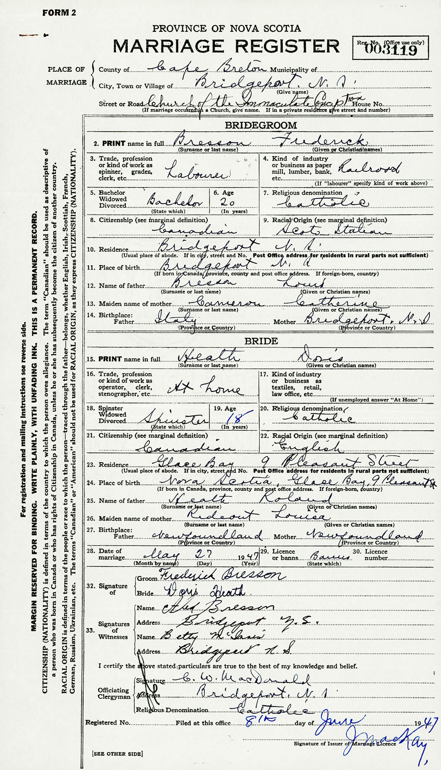 11. Place of birth Bridgeport Nova Scotia