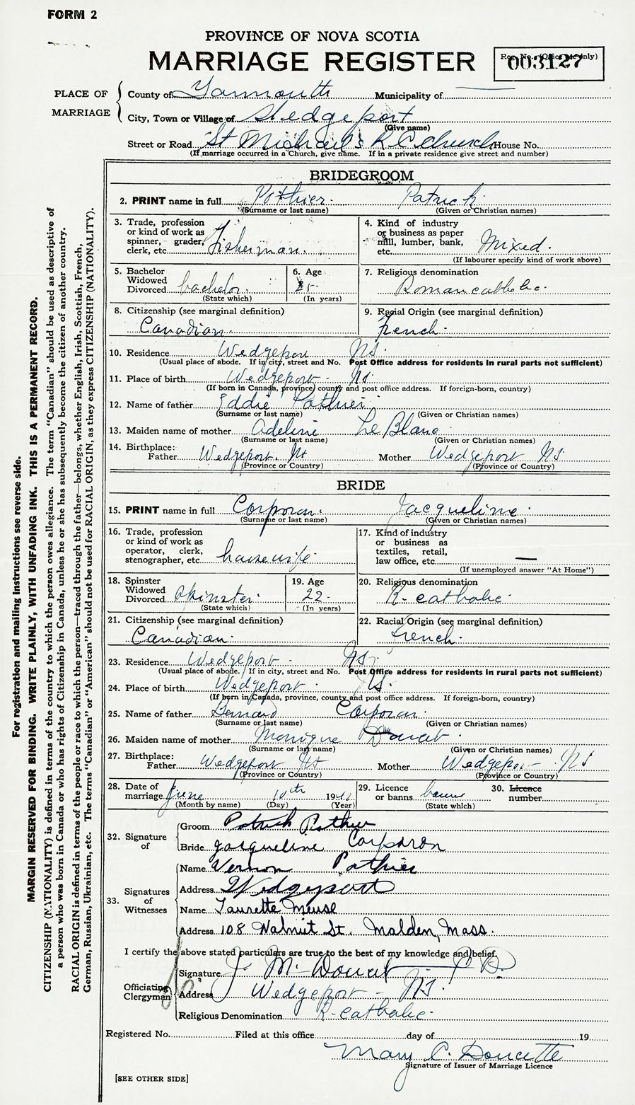 27. Birthplace Father Wedgeport Nova Scotia Mother Wedgeport Nova Scotia