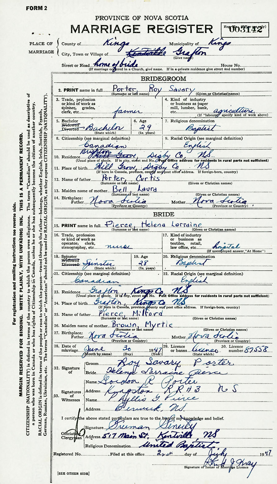 28. Date of marriage June 30 1947 29. By license or banns License 30. License number 87558