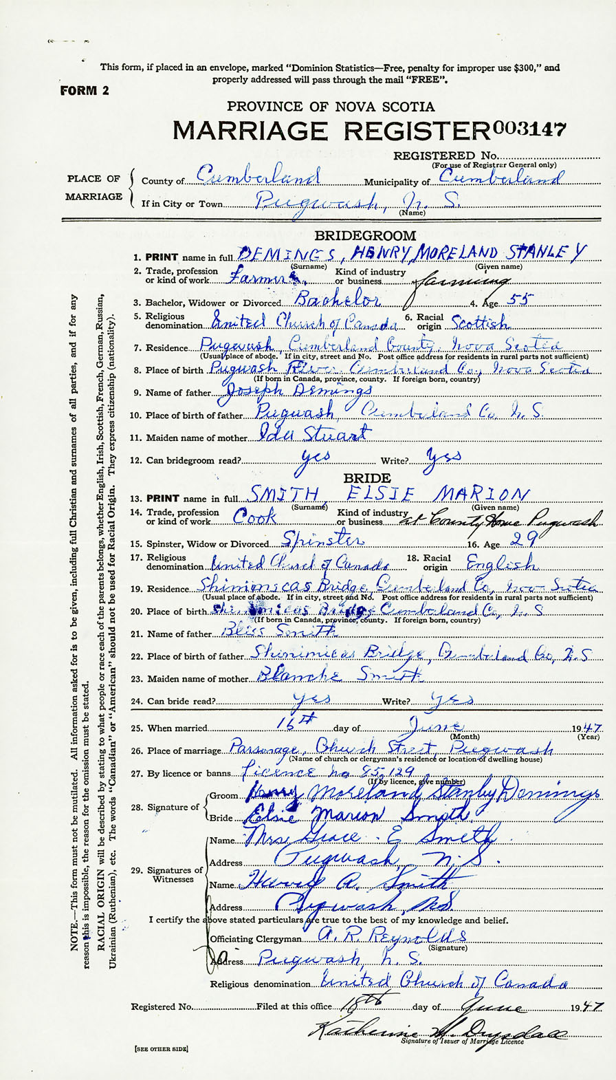 PLACE OF MARRIAGE County of Cumberland in City or Town Pugwash