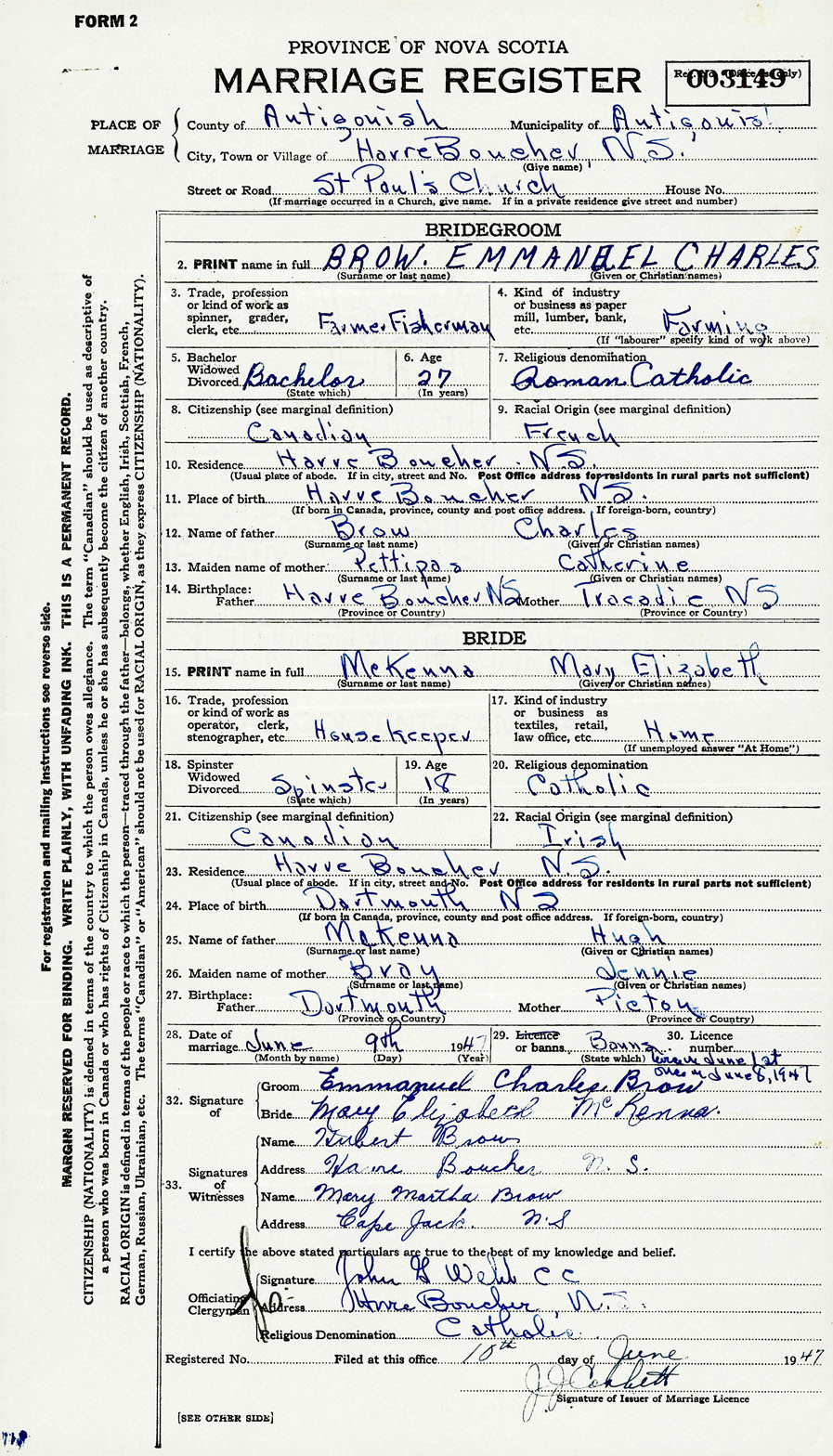 28. Date of marriage June 9 1947 29. By license or banns License 30. License number