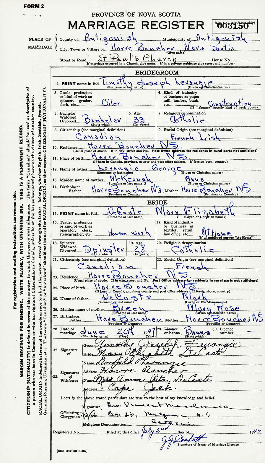 28. Date of marriage June 26 1947 29. By license or banns License 30. License number