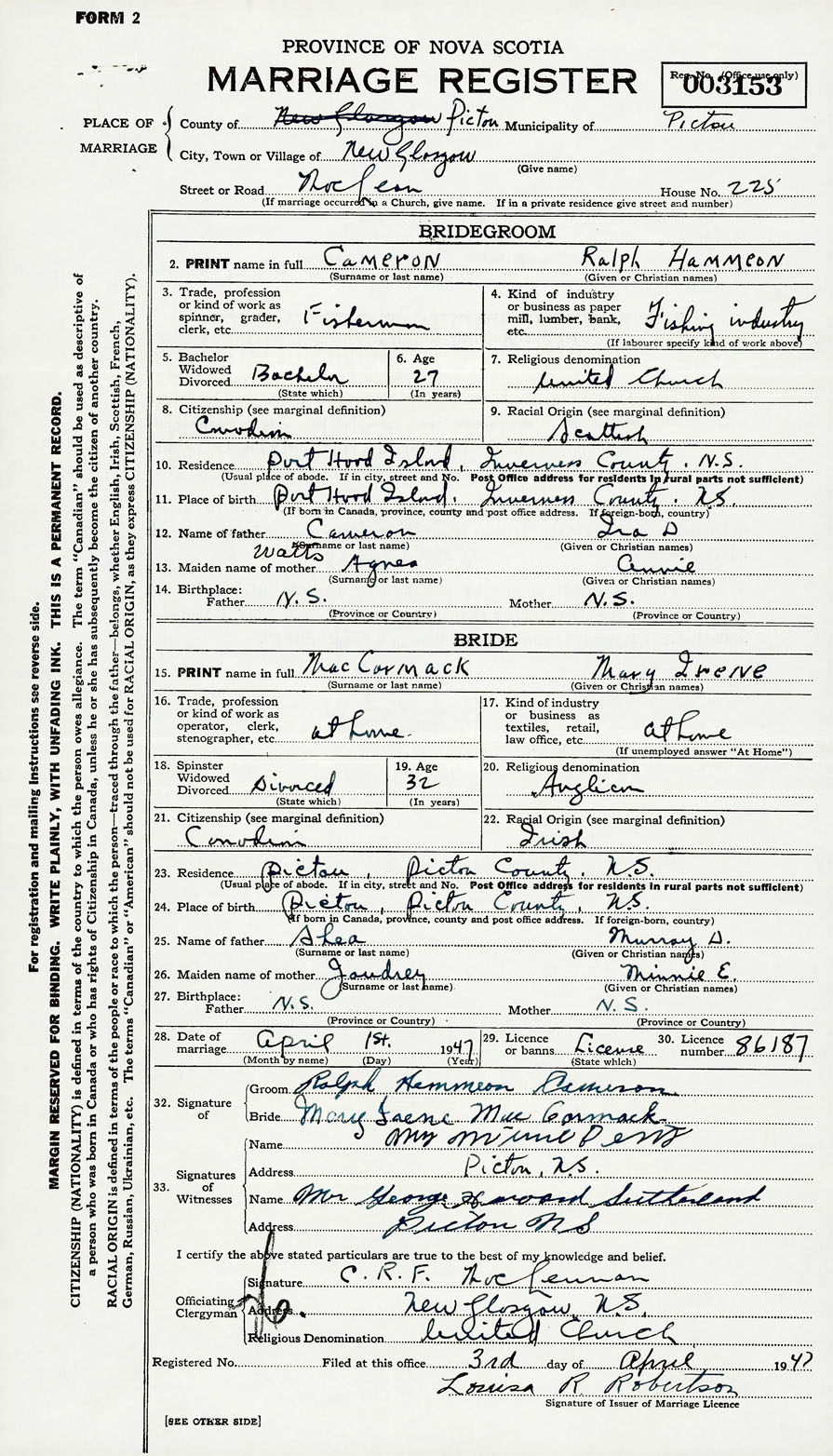 PLACE OF MARRIAGE County of Pictou