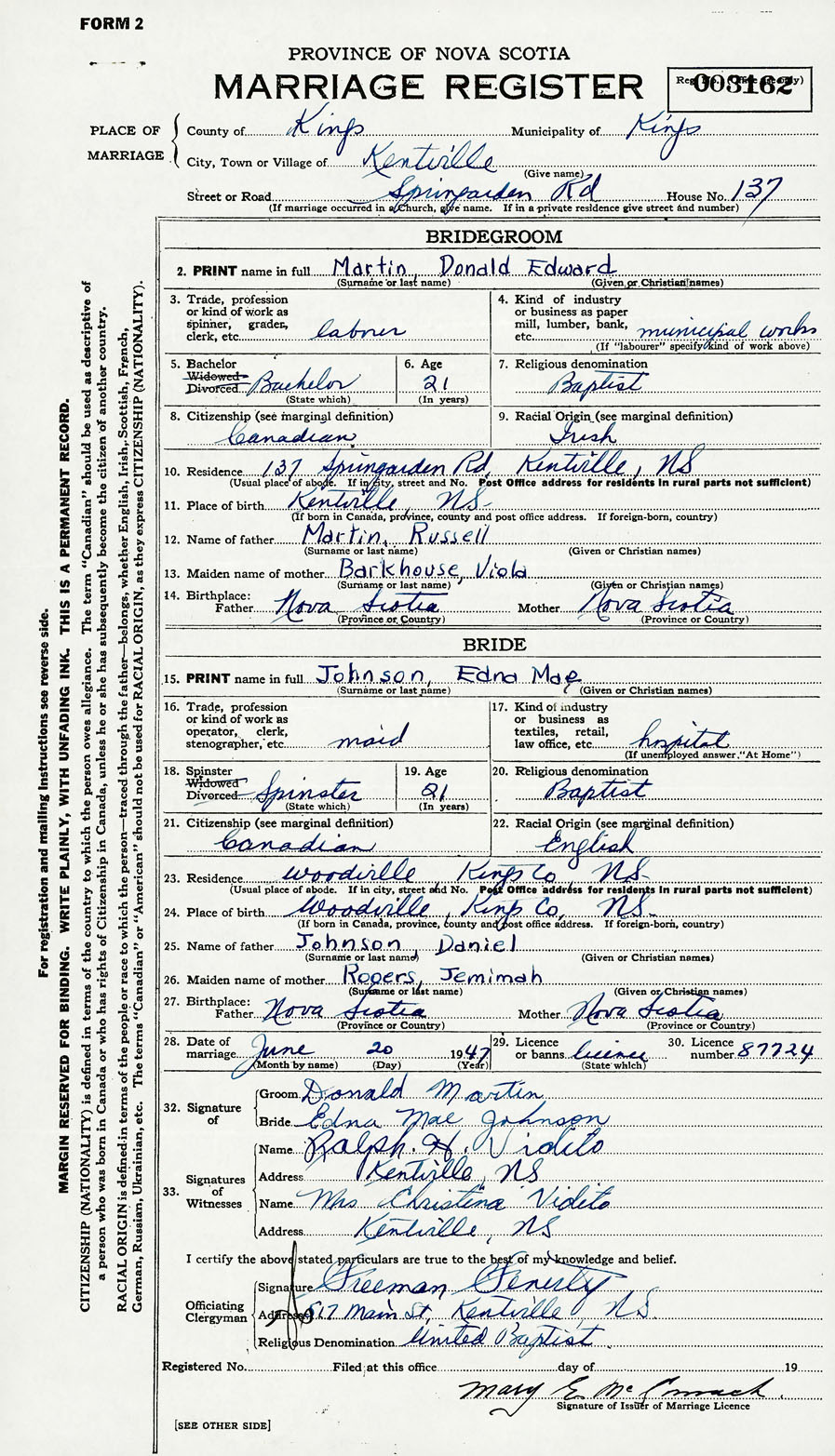 28. Date of marriage June 20 1947 29. By license or banns License 30. License number 87724