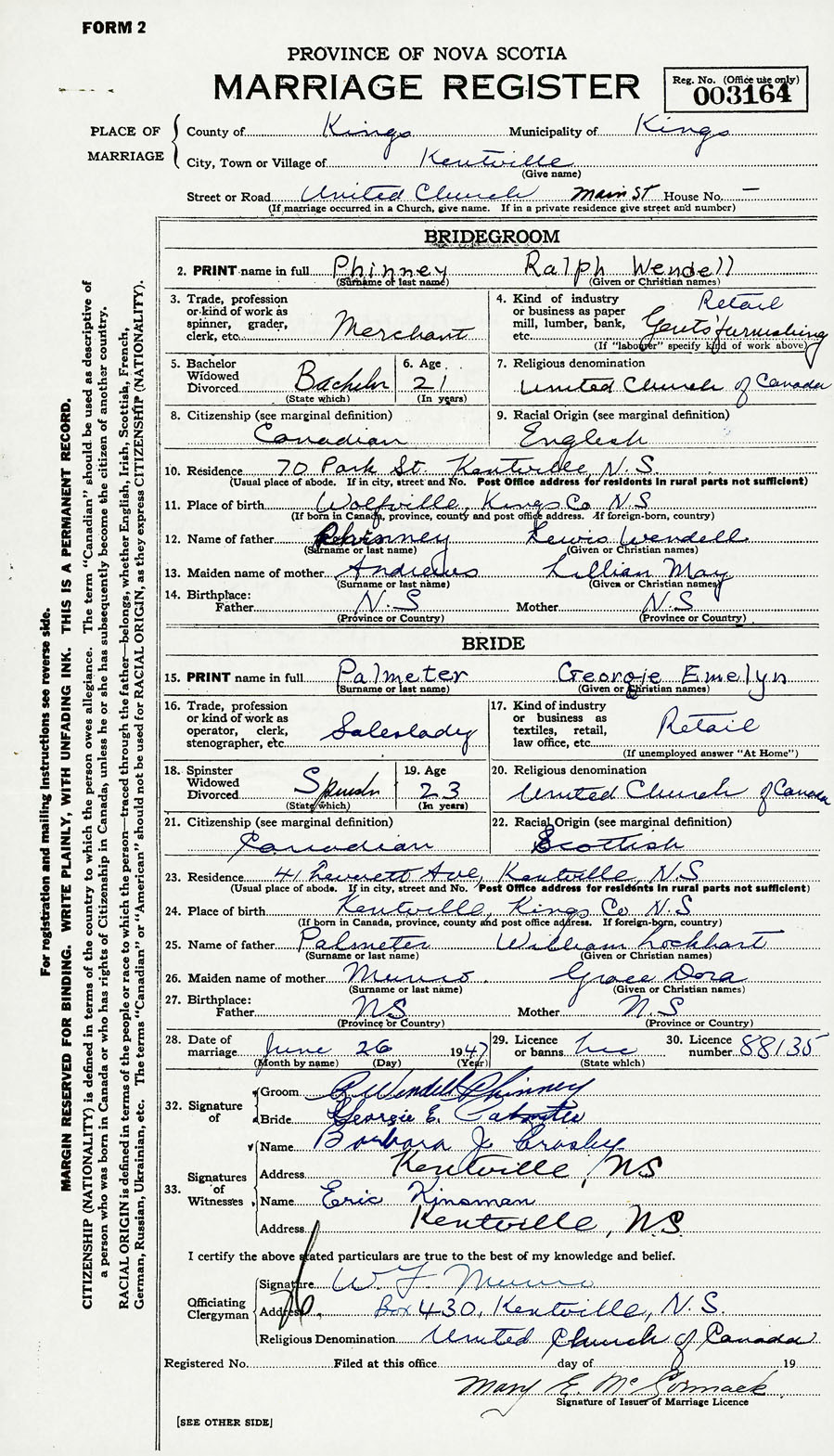 28. Date of marriage June 26 1947 29. By license or banns License 30. License number 88135