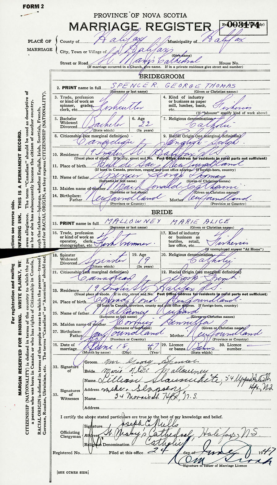28. Date of marriage June 18 1947 29. By license or banns Banns 30. License number Banns