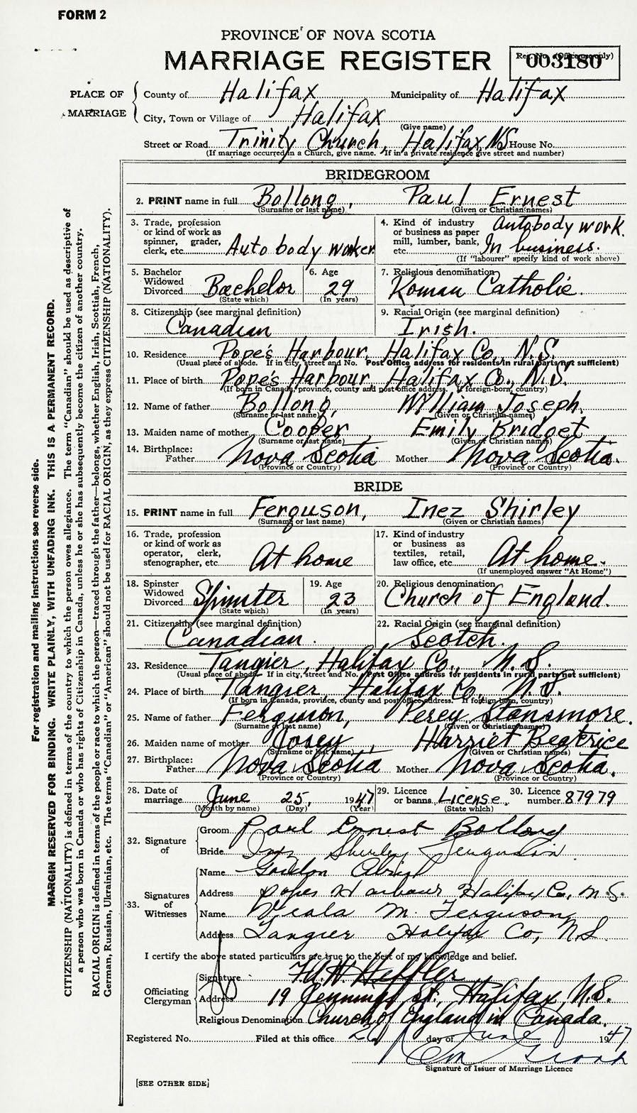 11. Place of birth Pope's Harbour, Halifax County, Ns