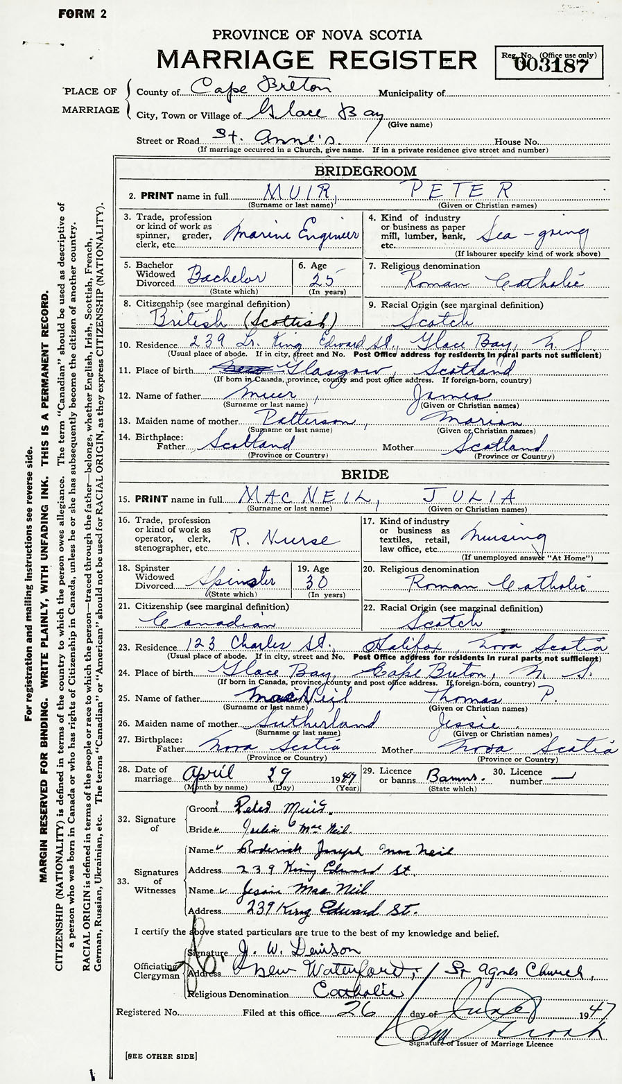 28. Date of marriage April 29 1947 29. By license or banns License 30. License number