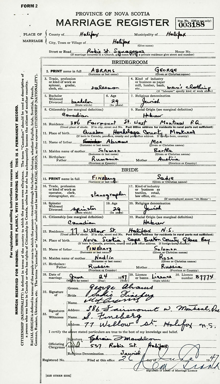 21. Citizenship Canadian 22. Racial origin Hebrew
