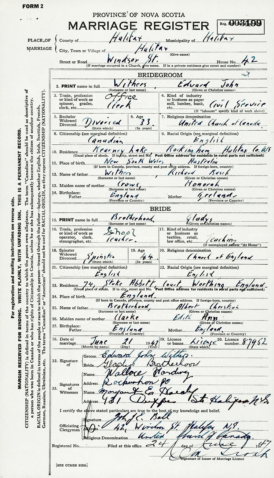 28. Date of marriage June 21 1947 29. By license or banns License 30. License number 87952