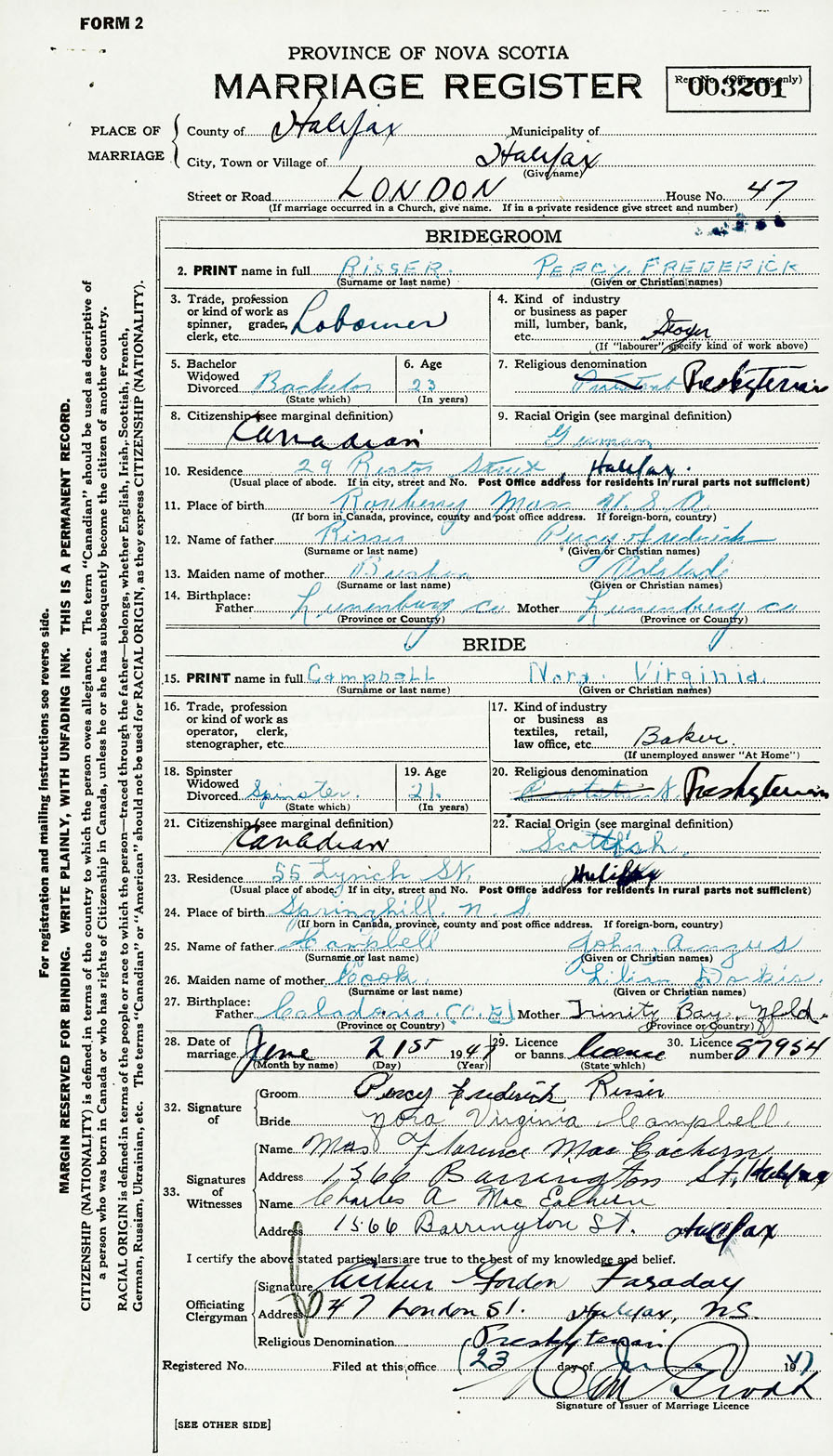 27. Birthplace Father Caledonia, Cape Breton County, Nova Scotia Mother Trinity Bay, Newfoundland