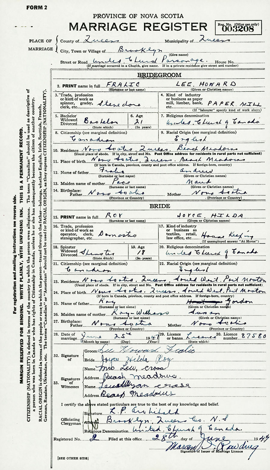 28. Date of marriage June 25 1947 29. By license or banns License 30. License number 87580
