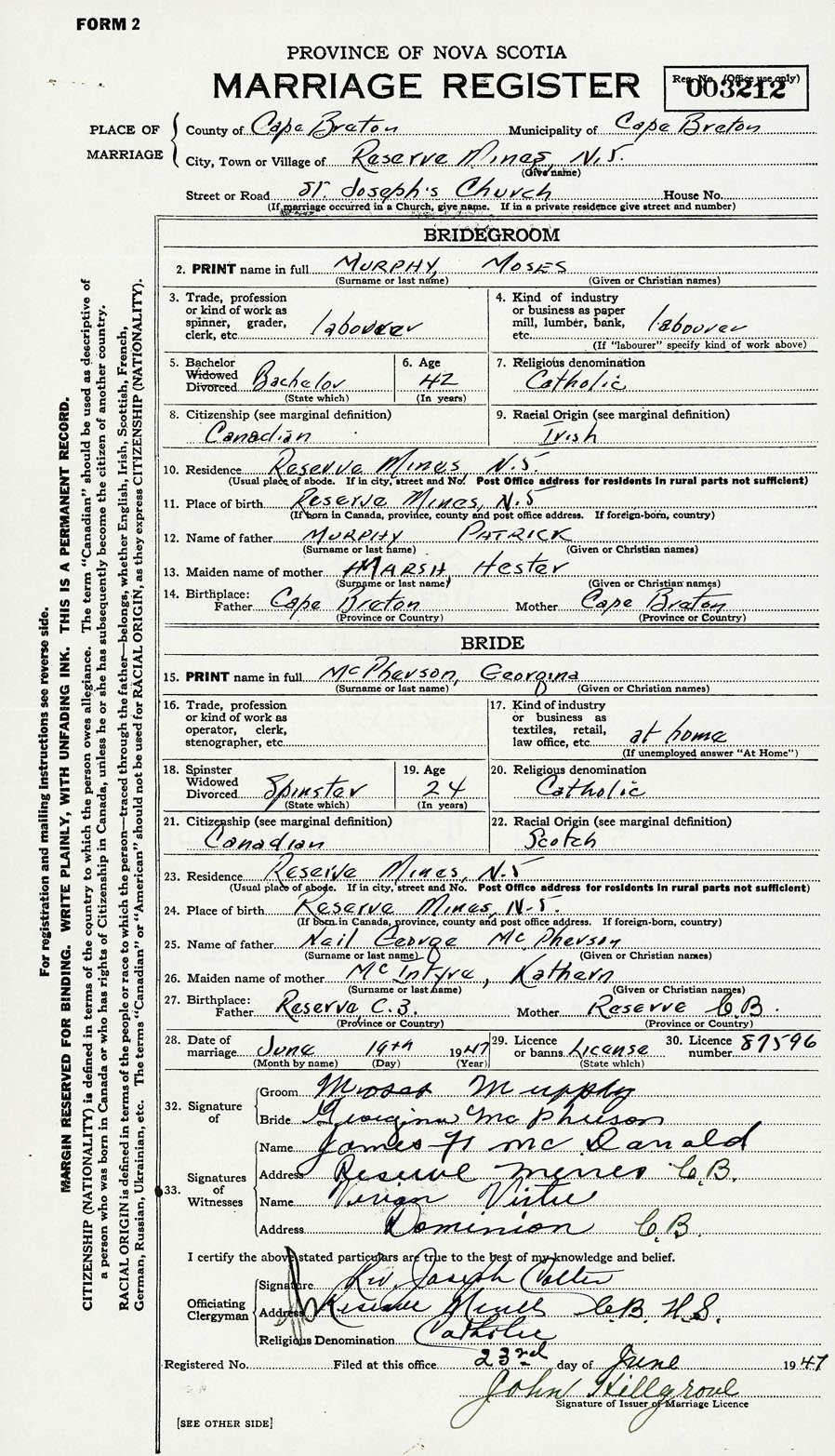 28. Date of marriage June 19 1947 29. By license or banns License 30. License number 87596
