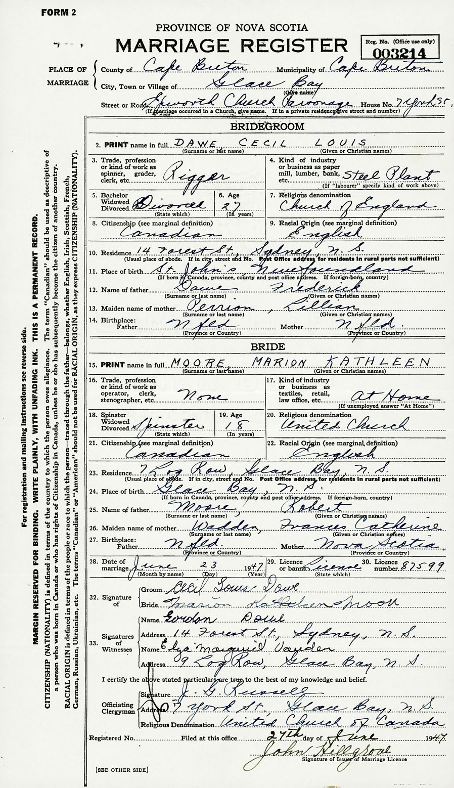 28. Date of marriage June 23 1947 29. By license or banns License 30. License number 87599