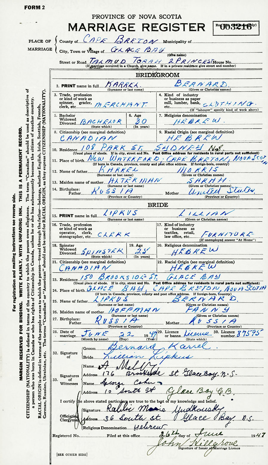 28. Date of marriage June 22 1947 29. By license or banns License 30. License number 87595