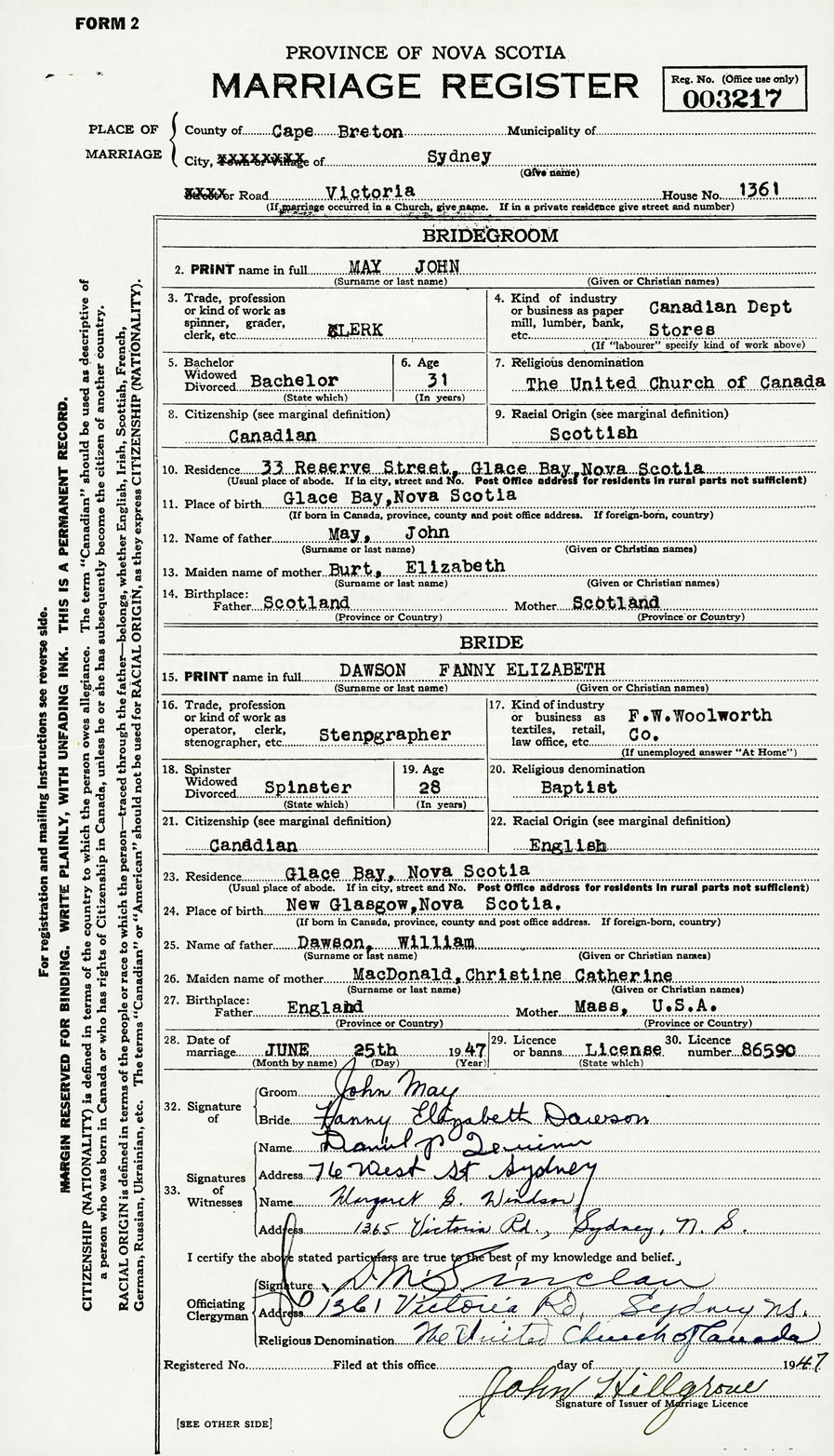 28. Date of marriage June 25 1947 29. By license or banns License 30. License number 86590