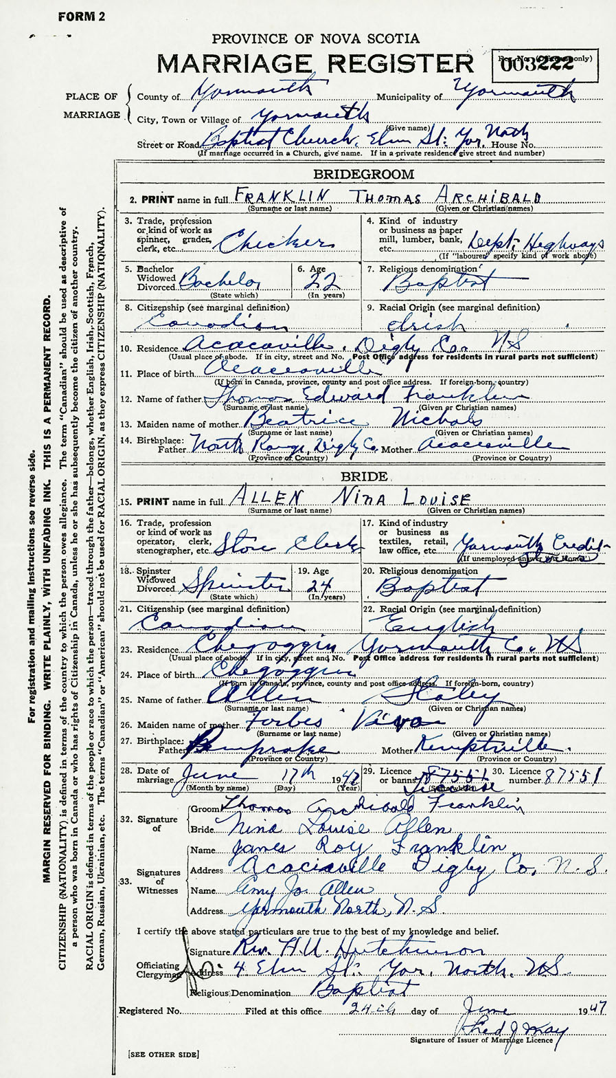 Registration: Year: 1947 number: 003222