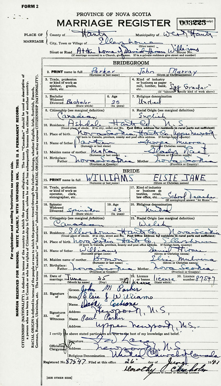 28. Date of marriage June 25 1947 29. By license or banns License 30. License number 87547