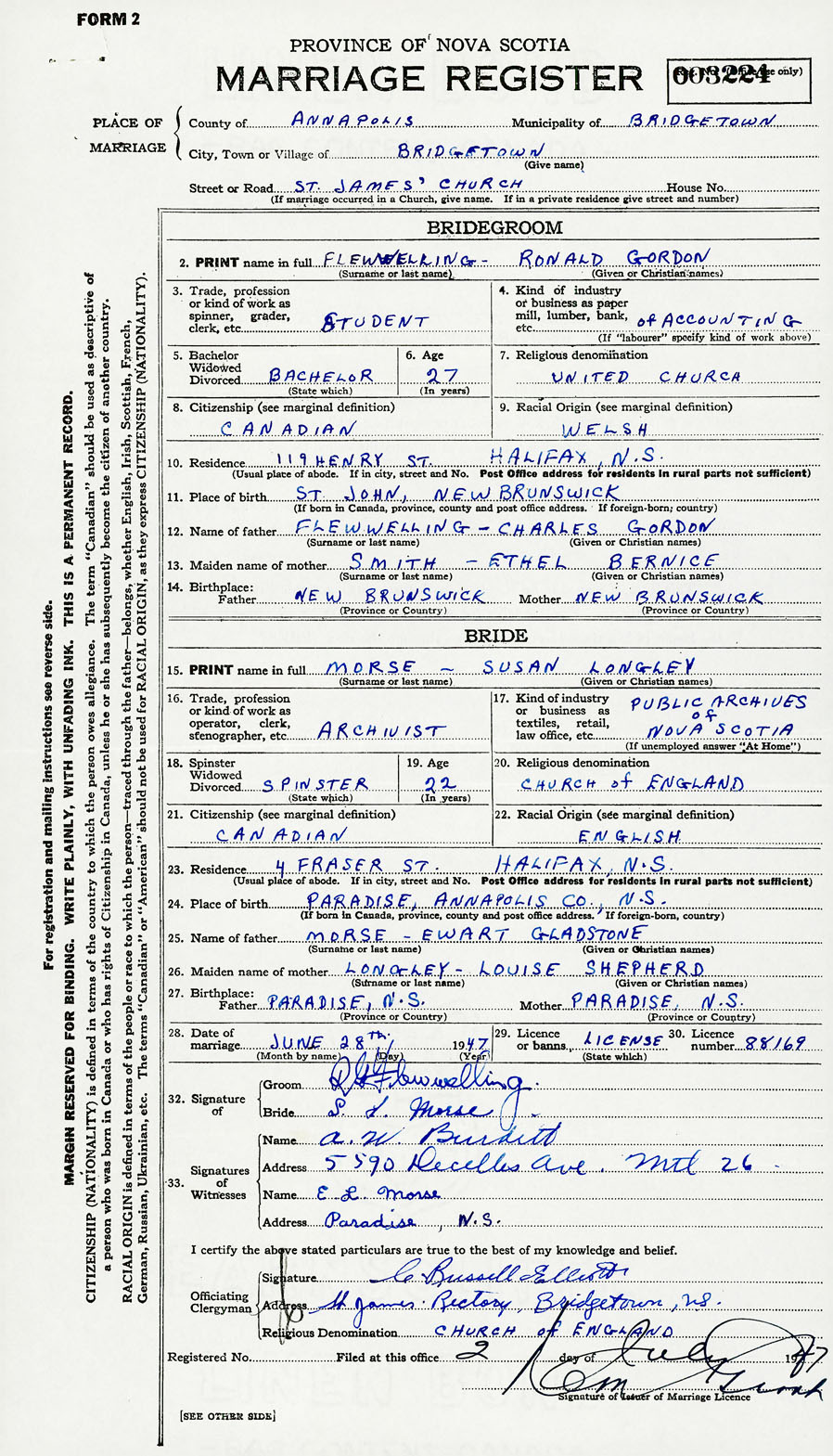 28. Date of marriage June 28 1947 29. By license or banns License 30. License number 88169